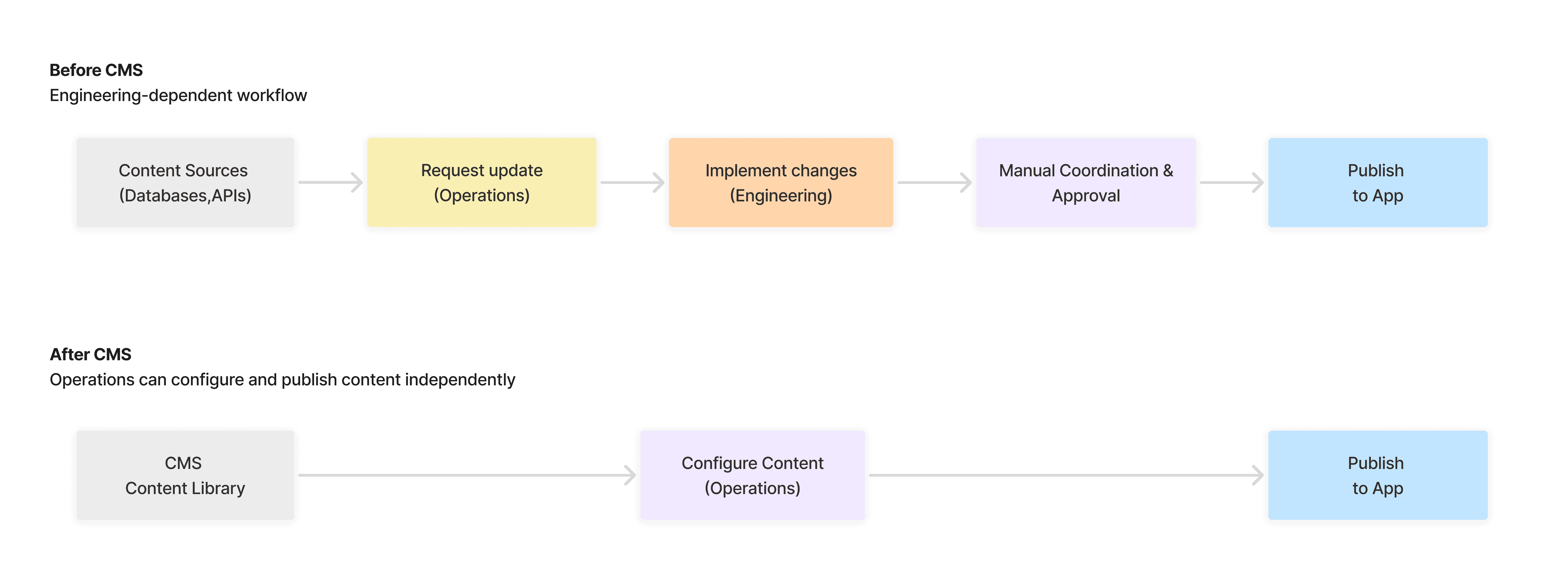 I started by mapping the existing and ideal workflow for managing content across teams. This helped us identify where manual coordination and engineering support were required before content could be published.